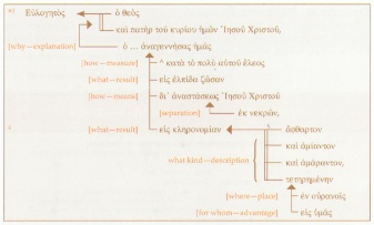 Where Huffman is really unique (and what makes this guide desirable especially for a second-year Greek student or pastor) is in his part 3 on diagramming. He briefly treats “technical diagramming” (the kind some of us had to do for English in 5th grade–showing syntactical relationships at the word level) and arcing, then moves into a rich, 22-page description of “phrase diagramming,” which looks like this: