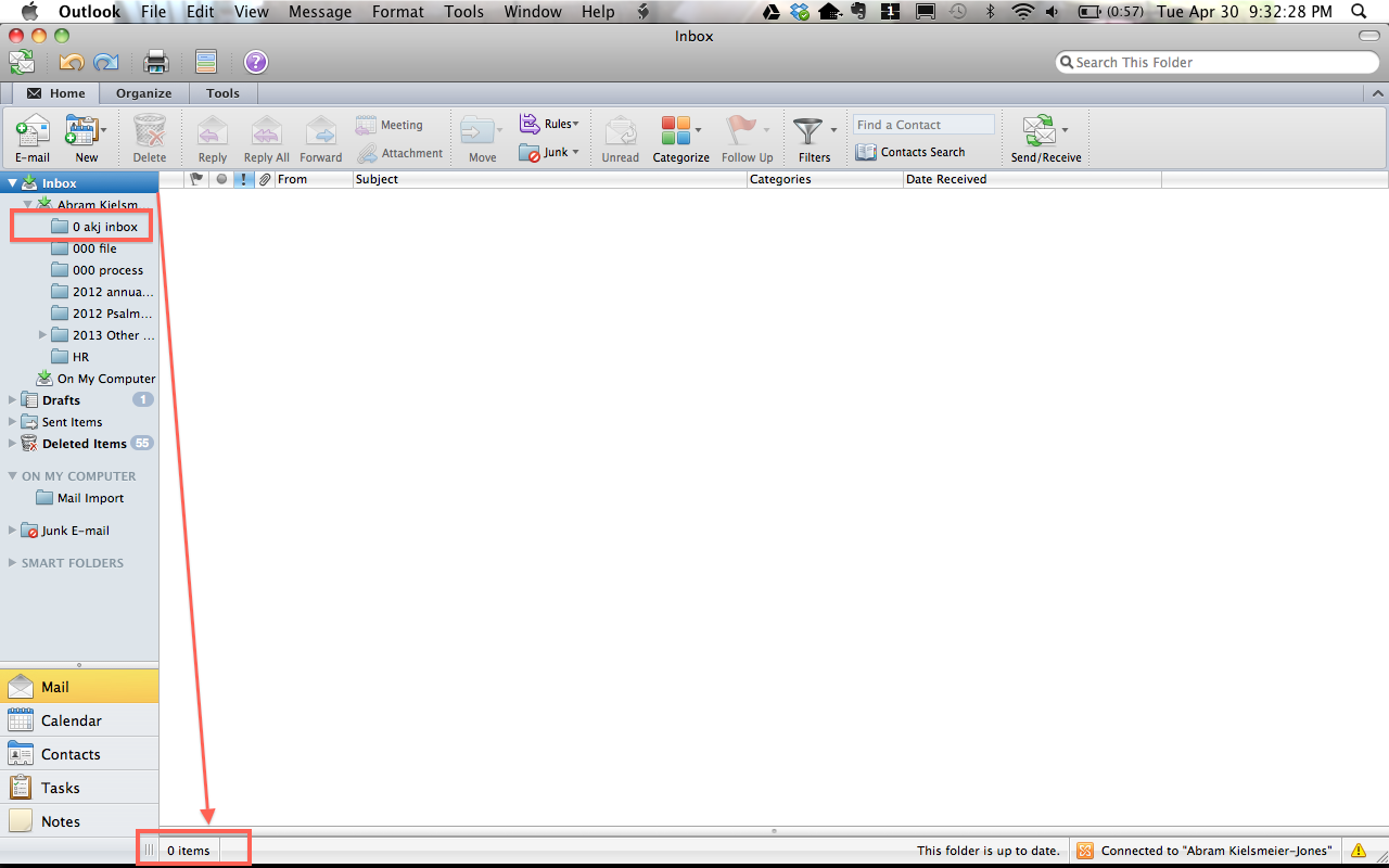 Even with a mere 40 messages here, I’m still a ways away from inbox zero. So I’ve created a folder called “0 akj inbox” that shows up underneath my actual Inbox. The “0” is so it alphabetizes at the top. I leave all my sub-folders expanded so I can always see “0 akj inbox.” Then I make this move: