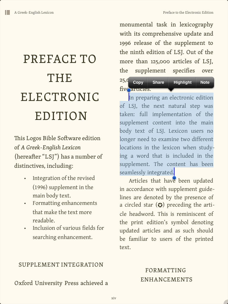 The massive LSJ Greek-English Lexicon for Logos (9th ed. with revised supplement) is an invaluable resource for Greek lexicography, covering the classical and New Testament eras. I wrote more about the lexicon in Logos here. How does it look and work on an iPad?