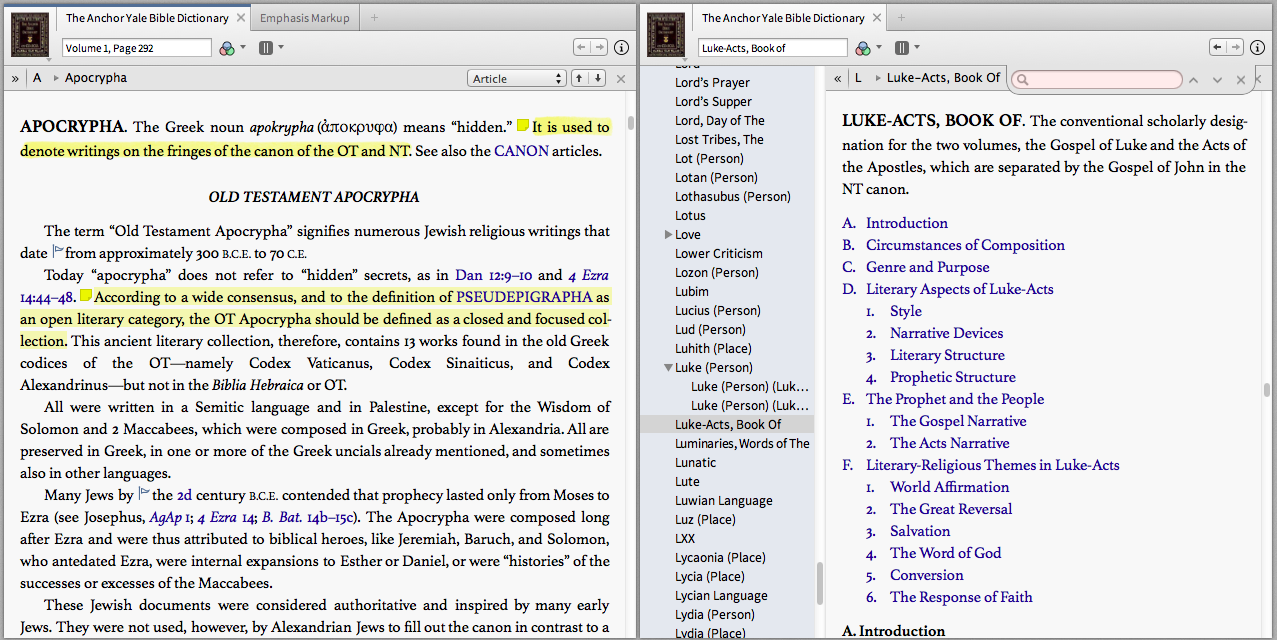 As with the rest of Logos’s resources, all of the content in blue above is hyperlinked. So with the verse references you can hover over them for a popup of the verse text, or click on a hyperlink to open its contents in a new window. In the right half of the screen above, clicking on a section in the article takes you directly there.