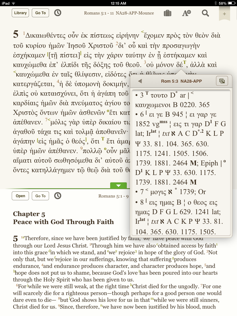 One critique of the NA28 apparatus is that the text-critical sigla are not hyperlinked to their meanings. In the Accordance version of NA28, for example, when you hover/click/tap on sigla and abbreviations from the apparatus, you instantaneously see (in a popup window or instant details window) what they represent or stand for. In Olive Tree, there is a workaround (described here: bookmark the relevant section of the introduction for quick reference), but this is not an improvement on what one would have to do with a print text anyway. It’s not unmanageable, but also not what one might hope for in this medium. So one will need to regularly consult the NA28 introduction, which is included with the text.