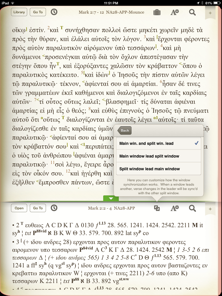 The app allows for you to view one or two resources at a time. This is the same as the iOS apps in Accordance and Logos. What I like about this app is that you can choose whether you want to sync the two windows or not. You can also choose which of the two windows “leads” the other, if you tie them together. Or you can set it up so that whichever one you move (top or bottom/left or right) causes the other to move:
