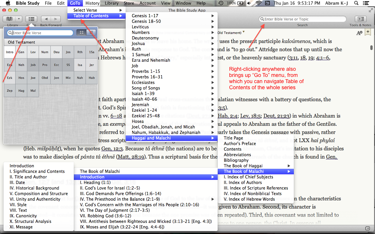 Note that from the Go To drop-down menu, I can keep following the sub-menus till I get to a specific place in the commentary (Introduction to Malachi in the instance above). One could also do this from the Go To item in the toolbar, which allows for both verse searching and Table of Contents navigation.