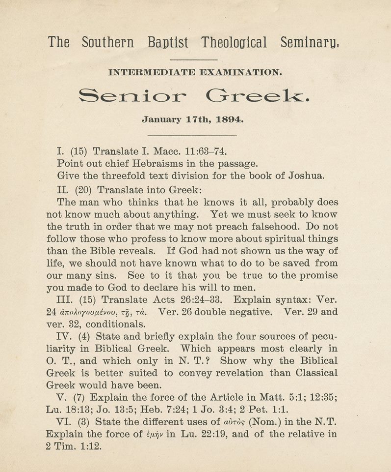 Finally, check out Jacob Cerone’s post of a Greek exam given in the late 19th century by John Broadus and A. T. Robertson (pictured at the top of this post). He even takes part of it and posts his answers. Nice work, Jacob!