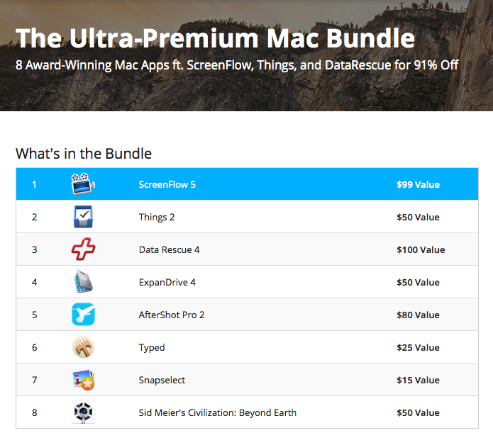 Things2, a sleek task management app, is part of the bundle. It alone retails for $50. Also included is the otherwise $99 ScreenFlow 5, a robust piece of software for screencasting and video editing on Mac.