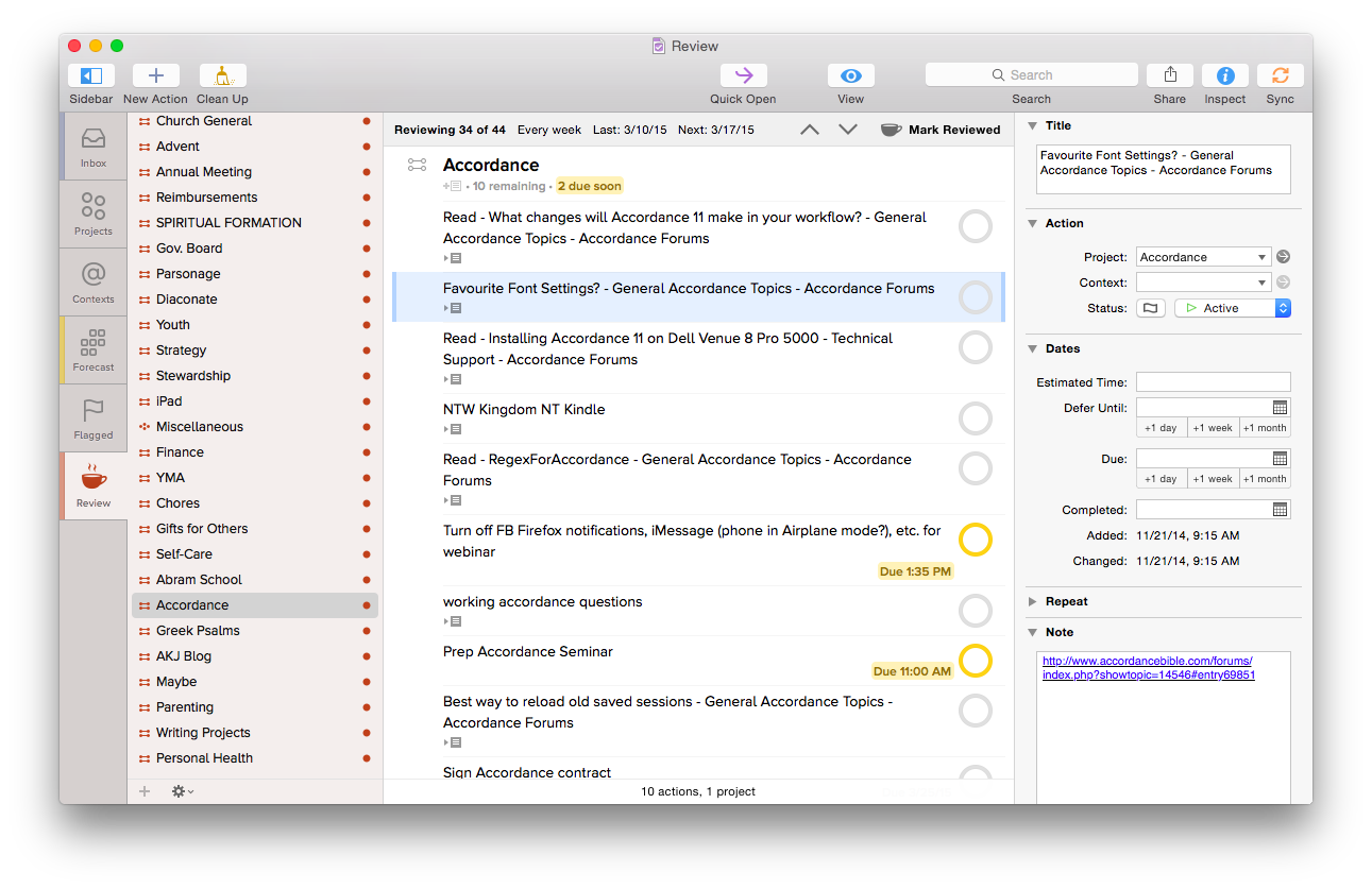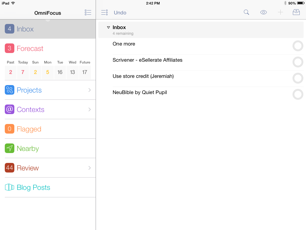 Projects help you break a bigger endeavor down into its component actions. Projects can be Sequential (you have to do action 1 before you can do action 2) or Parallel (it doesn’t matter in which order you do the individual tasks). For that matter Projects can just have what Omni refers to as loosely-related but not interdependent “Single Actions,” like a grocery shopping list. Contexts allow you to organize actions according to the things/people/environment you need to do them: Office, iPad, Internet, Computer, Car (careful!), etc. The Forecast view shows your tasks chronologically in one place–I spend most of my time in this view. Or you can just make a quick entry in the Inbox, and then decide how to categorize it later.
