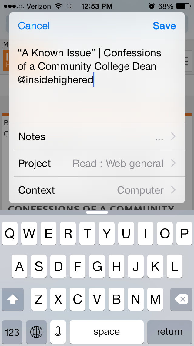 From Safari, for example, the Note is automatically populated with the article link, and I can set the Project and Context: