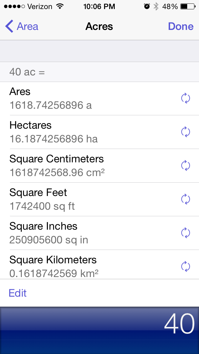Listening to the new Kendrick Lamar, I might want to know how many square miles 40 acres is. With PCalc, I have my answer within a few taps: