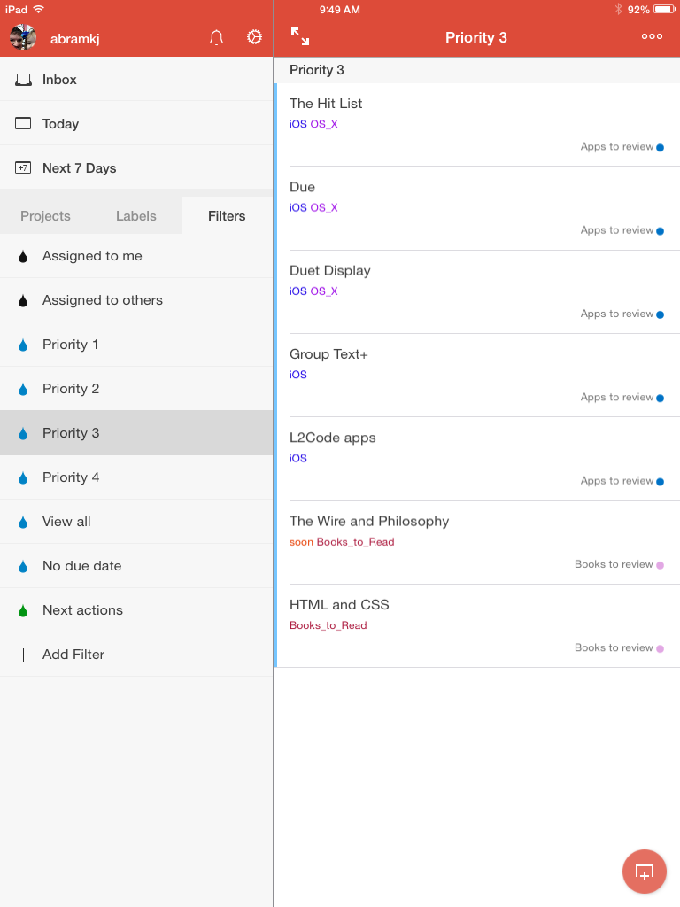 My weekly review–a built-in feature of OmniFocus–is what allows me to set due dates sparingly, a key practice for effective project and task management. Todoist’s Karma is fun, but feels gimmicky. And their GTD page has suggestions for something like a weekly review (it would be easy enough to set up a recurring task for it, employing Filters and Labels as needed), but I have gotten so used to OmniFocus’s Review function that not having one already in the app is tough. But it won’t be a deal breaker for a lot of folks.