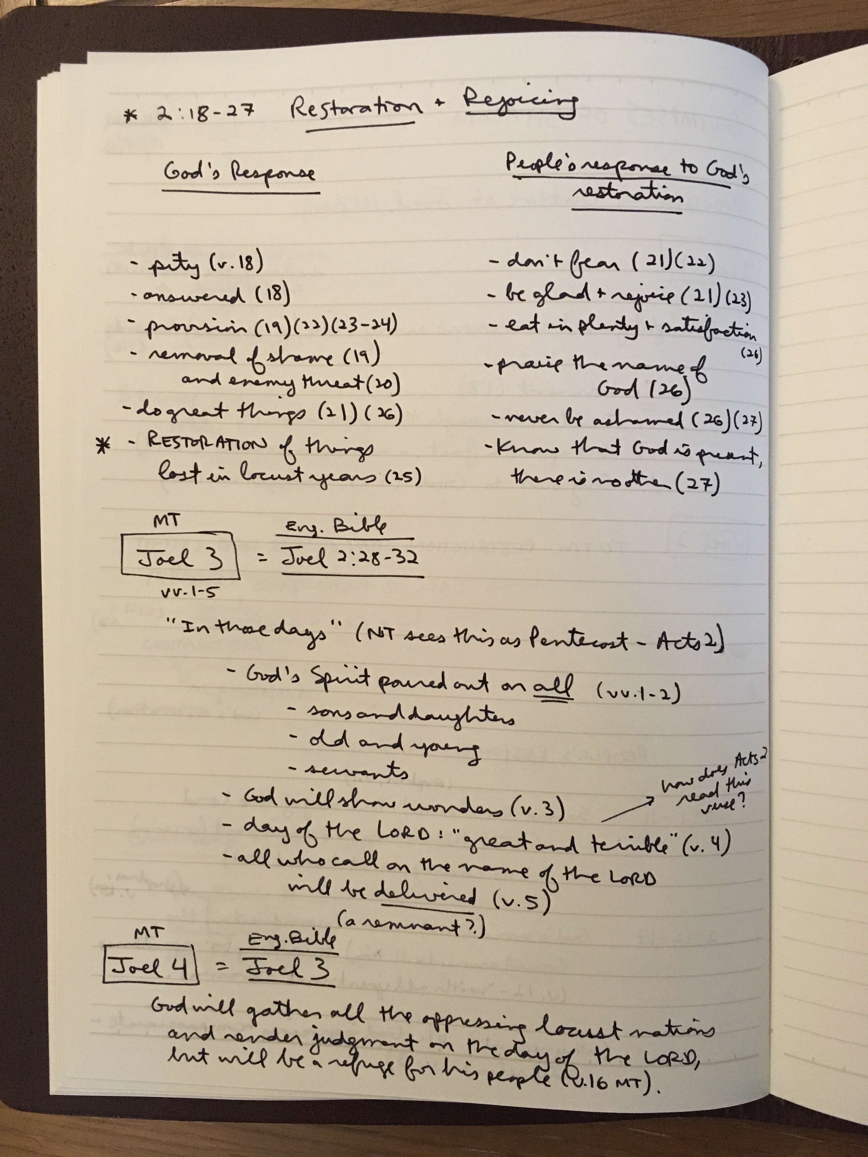 Here’s my two-page provisional outline of the book of Joel, complete with a misspelling of “devastation”: