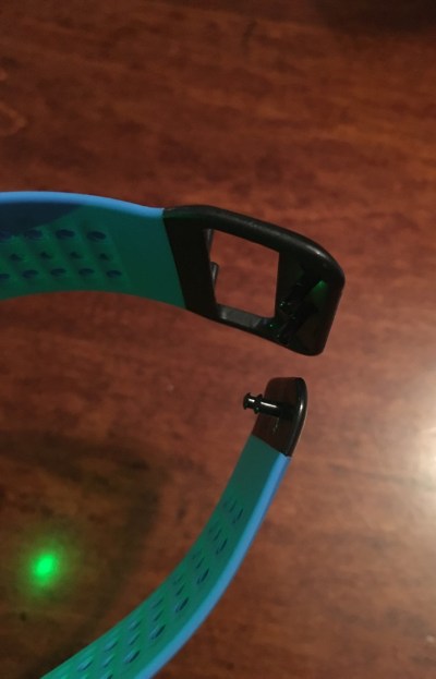 The watch band clips together in three different spots, using a clasp mechanism I haven’t seen in any watch (fitness or otherwise) before. (The green in the photo below is the light from the wrist-based heart rate sensor.) At first I didn’t like the clasps, but the security of the band (and ease of putting it on and taking it off) caused the mechanism to grow on me.