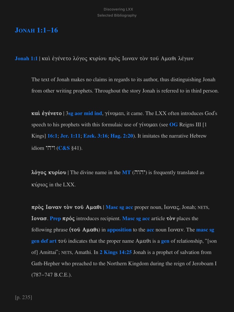Each LXX book has a short introduction followed by a selected bibliography. Here, for example, is the intro to Jonah, shown on the Mac version of Accordance: