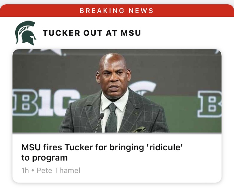 MSU says it is firing Tucker “for cause.” The cause: sexually harassing a woman who survived sexual violence and was now working with MSU football in her job as an advocate and trainer for sexual violence prevention.