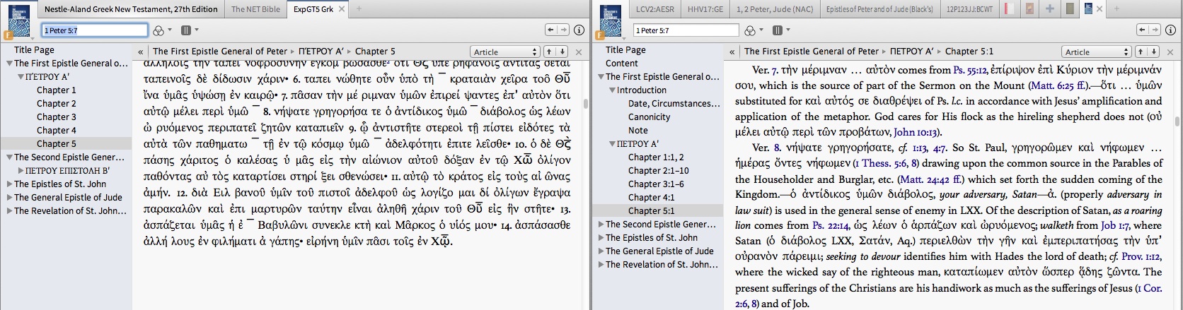 My personal experience with Logos 5 (which was also true of Logos 4) is that it handles and operates more smoothly on a PC than on a Mac. More often than I’ve liked, I’ve found myself waiting for the spinning rainbow pinwheel after entering a search query or scrolling down through a resource. The speed issue is not really present on a PC, though. Having fewer tabs open on a Mac makes for fluid operation, but Logos on PC is the way to go for complex, involved operations with multiple resources open at once.