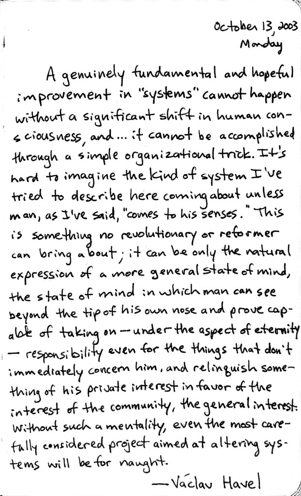 A genuinely fundamental and hopeful improvement in “systems” cannot happen without a significant shift in human consciousness, and… it cannot be accomplished through a simple organizational trick. It’s hard to imagine the kind of system I’ve tried to describe here coming about unless man [sic], as I’ve said, “comes to his senses.” This is something no revolutionary or reformer can bring about; it can only be the natural expression of a more general state of mind, the state of mind in which man can see beyond the tip of his own nose and prove capable of taking on—under the aspect of eternity—responsibility even for the things that don’t immediately concern him, and relinquish something of his private interest in favor of the interest of the community, the general interest. Without such a mentality, even the most carefully considered project aimed at altering systems will be for naught.