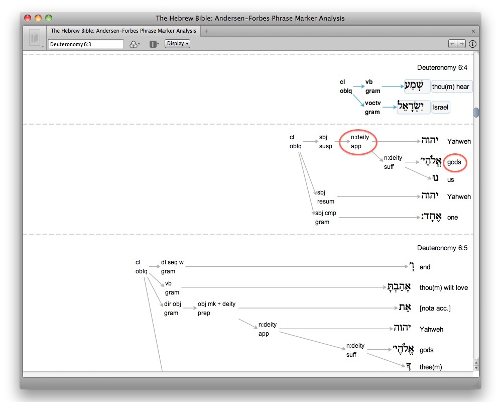 One highlight of the Hebrew resources available in this package is the Andersen-Forbes Phrase Marker Analysis. See here for a good description of the “seven layers of syntax information” included. (That’s better than a seven-layer burrito!) Here’s a screenshot: