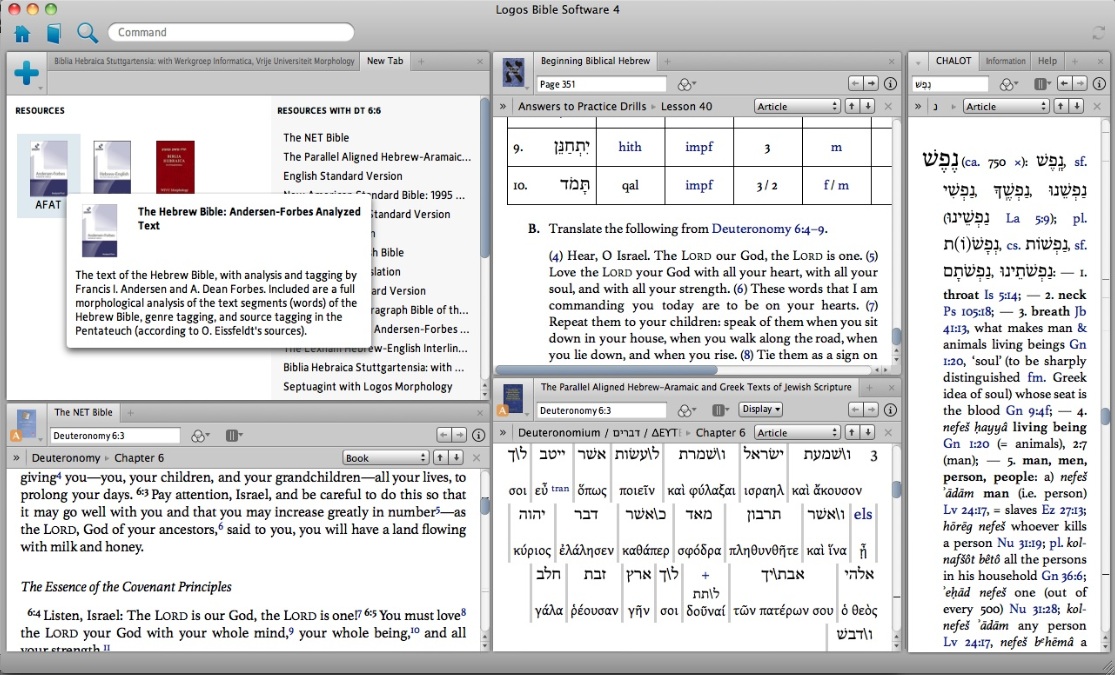 My go-to Hebrew lexicon is part of this base package: Concise Hebrew and Aramaic Lexicon of the Old Testament by Holladay (based on HALOT). And Landes’s ever-helpful Building Your Biblical Hebrew Vocabulary is included. There are some grammars like Futato and Gesenius. You can open all of these as stand-alone windows, or integrate them into what you’re doing in a given text. Here’s a Hebrew Bible layout I’m using at the moment (click for larger):