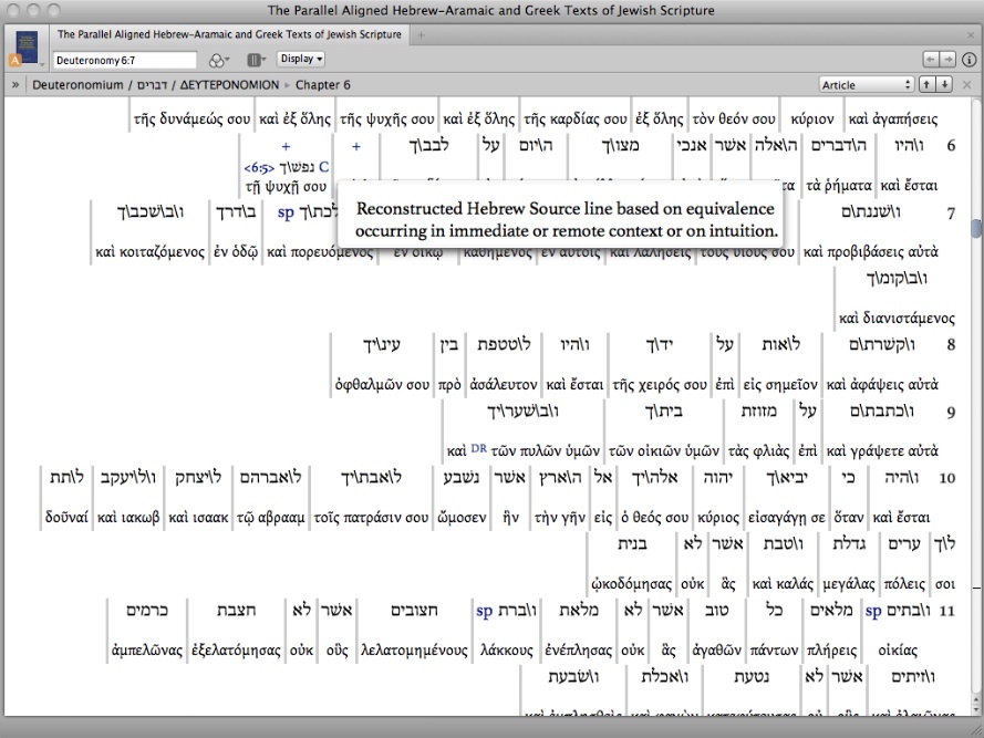Prof. Tov’s Parallel shows how the Hebrew and Aramaic line up against the Greek text on a word-by-word basis, but it does far more. In places where the Greek text doesn’t follow the Masoretic reading, Dr. Tov has provided a reconstruction of what the Hebrew or Aramaic text that the Greek translators were looking at might have been. In addition to these theoretical reconstructions, this database includes copious notes on the translation techniques used by the Septuagint translators, making this work a rather specialized commentary on the text. Did the Greek translators change the word order for grammatical or stylistic reasons? Did they change the voice of a verb from passive to active? Did they use a genitive absolute to translate an infinitive absolute? These types of observations are exhaustively noted in the alignment.