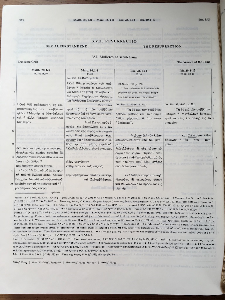 For those seemingly rare but delightful stories, parables, or teachings that all four Gospels treat, the Synopsis is a great way to see everything lined up together. Each year I choose whichever Easter account is the Gospel lectionary for the day, but I always look at all the Gospels side by side before preaching about the story of the resurrection.