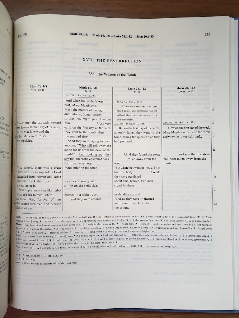 Easter is near, the time of year where—if I haven’t already reached for it recently—I pull out my favorite Gospels resource: Synopsis of the Four Gospels.