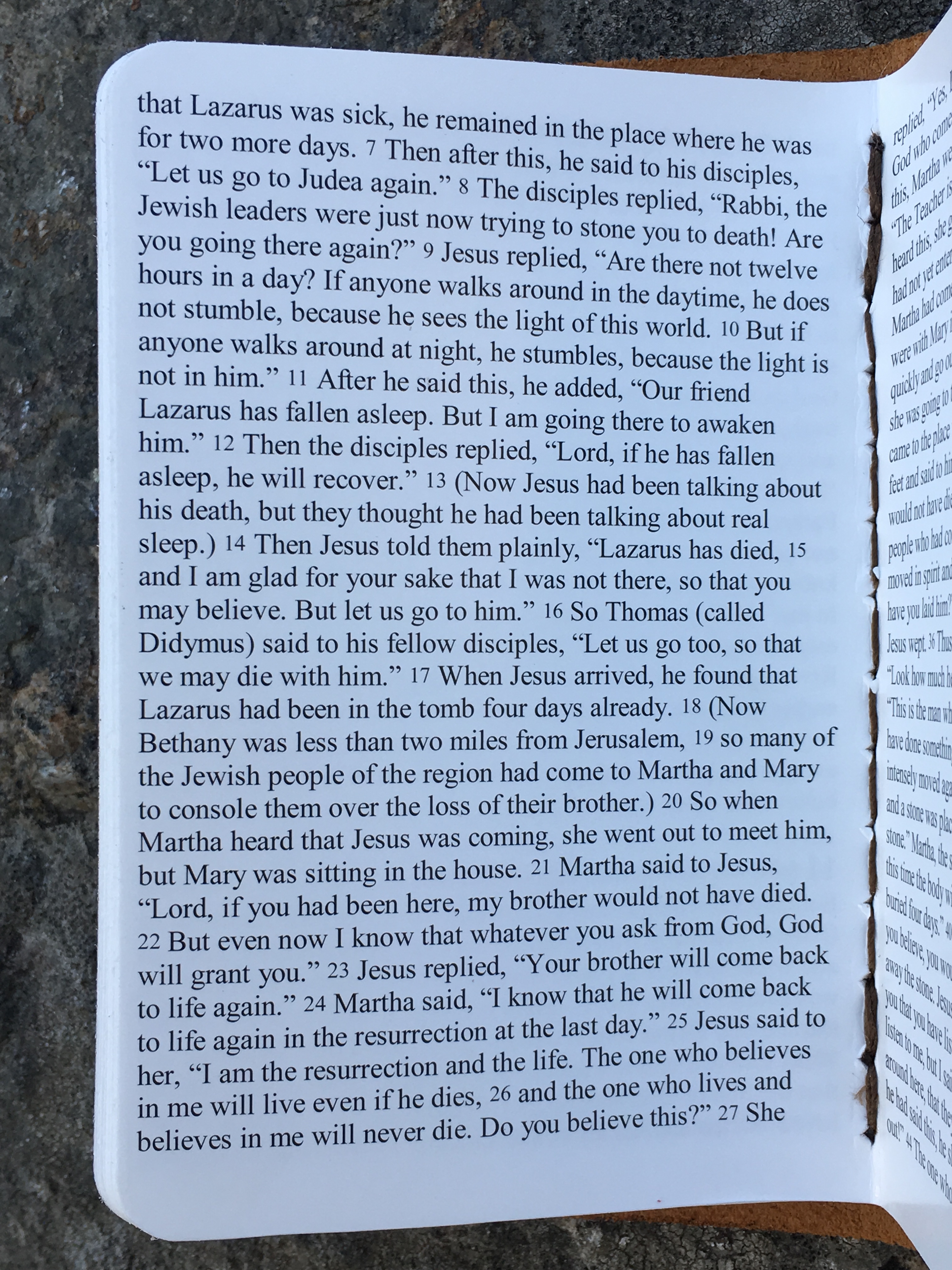There are also no paragraphs in this text. This means the 71-verse John 6 is a single paragraph in the Saddleback Leather Gospel of John. There is a single blank line between chapters, but especially with those five blank pages at the end, could not paragraph separations for greater readability have been employed?