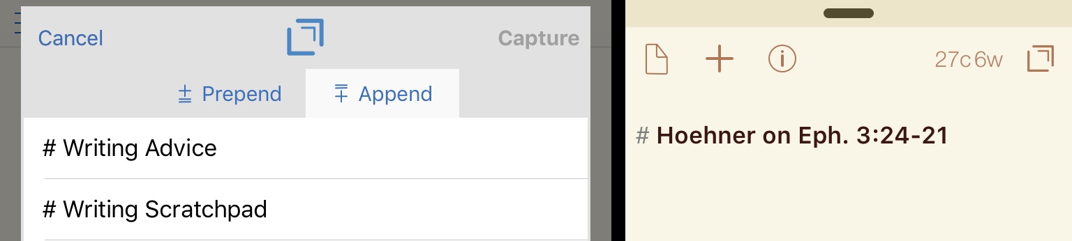 4. Now you can “Capture” to send the selected text right to Drafts OR prepend (add to the beginning) or append (add to the end) to an existing draft. (!)