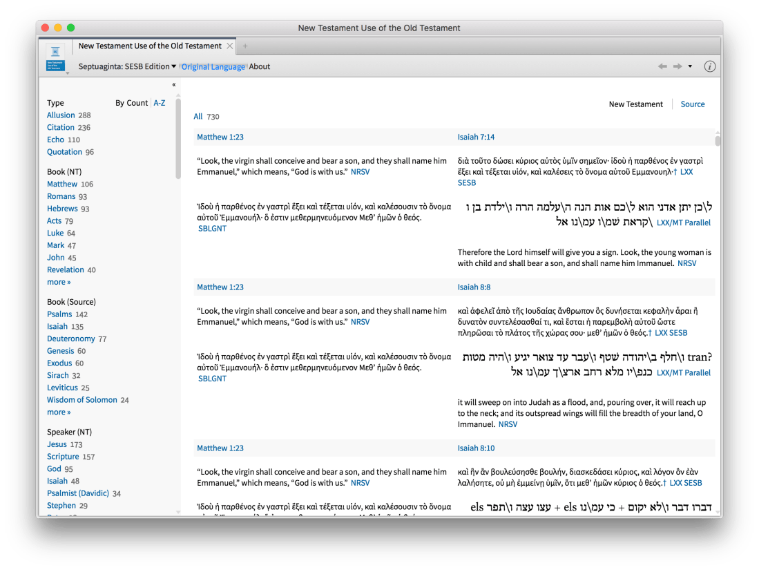 If software programs had Pulitzers, the NT Use of the OT should win one for best feature. Here’s what it looks like, including the sidebar, which allows you to focus your study using a ton of criteria. You could easily find, for example, all the times Matthew cites or alludes to an OT passage with Jesus in mind.