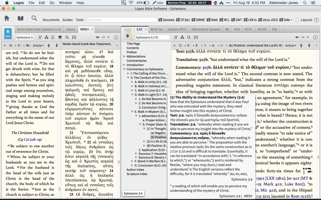 I’ve got a sweet Logos–>Drafts 4 workflow I’ve been using on the iPad for a few months now. (I find Logos’s iOS app to be significantly zippier than its Mac counterpart.) Allow me to demonstrate, using Harold W. Hoehner’s excellent Ephesians commentary.