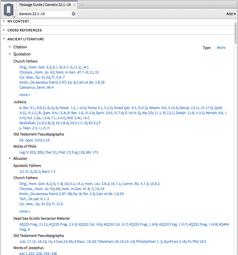 These are two new sections that can be accessed in the Guides (Passage Guide, Exegetical Guide, and Sermon Starter Guide is how I’ve gotten them). Have a look, and note that Ancient Literature is even sub-divided into Quotations, Allusions, and more: