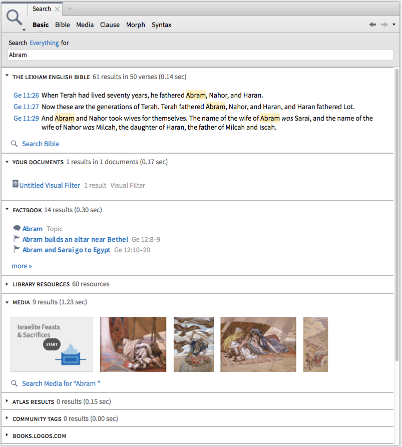 You can search across Bibles and commentaries and resources. Here are hit results, all of which are hyperlinked and can be explored for more, when I search everything for Abram: