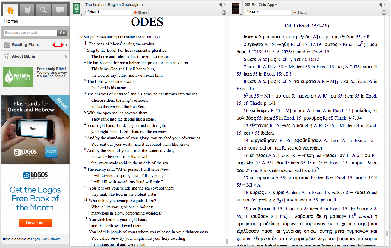 I haven’t found a way to make the ads at lower left disappear. Nor is Biblia intended to be as full-bodied as Logos (note that it’s in Beta). Since you can access it through any Web browser, it’s fairly universally accessible. Only real downside I’ve experienced: unlike Logos on iOS, Mac, and PC, you can’t highlight or take notes in any resources. But for reading texts–two at a time, as shown above–it’s pretty handy.