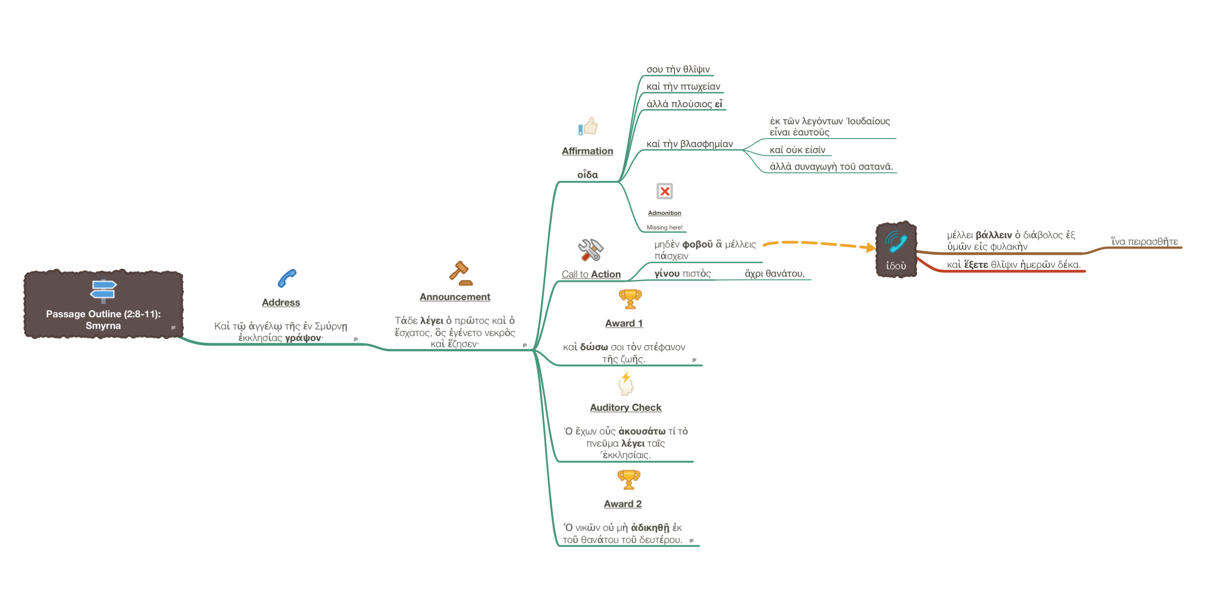 Here is my mind map of Greek Revelation 2:8-11, the letter to Smyrna. Interesting to see how the structure of this “oracle” is both similar to and different from the letter to Ephesus.