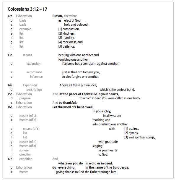 The main clauses are in bold, and subordinate clauses are indented under them. It’s easy to see, at a glance, how all the parts of a sentence and paragraph relate. The words in gray at left describe the function of each line (exhortation, expansion, etc.).