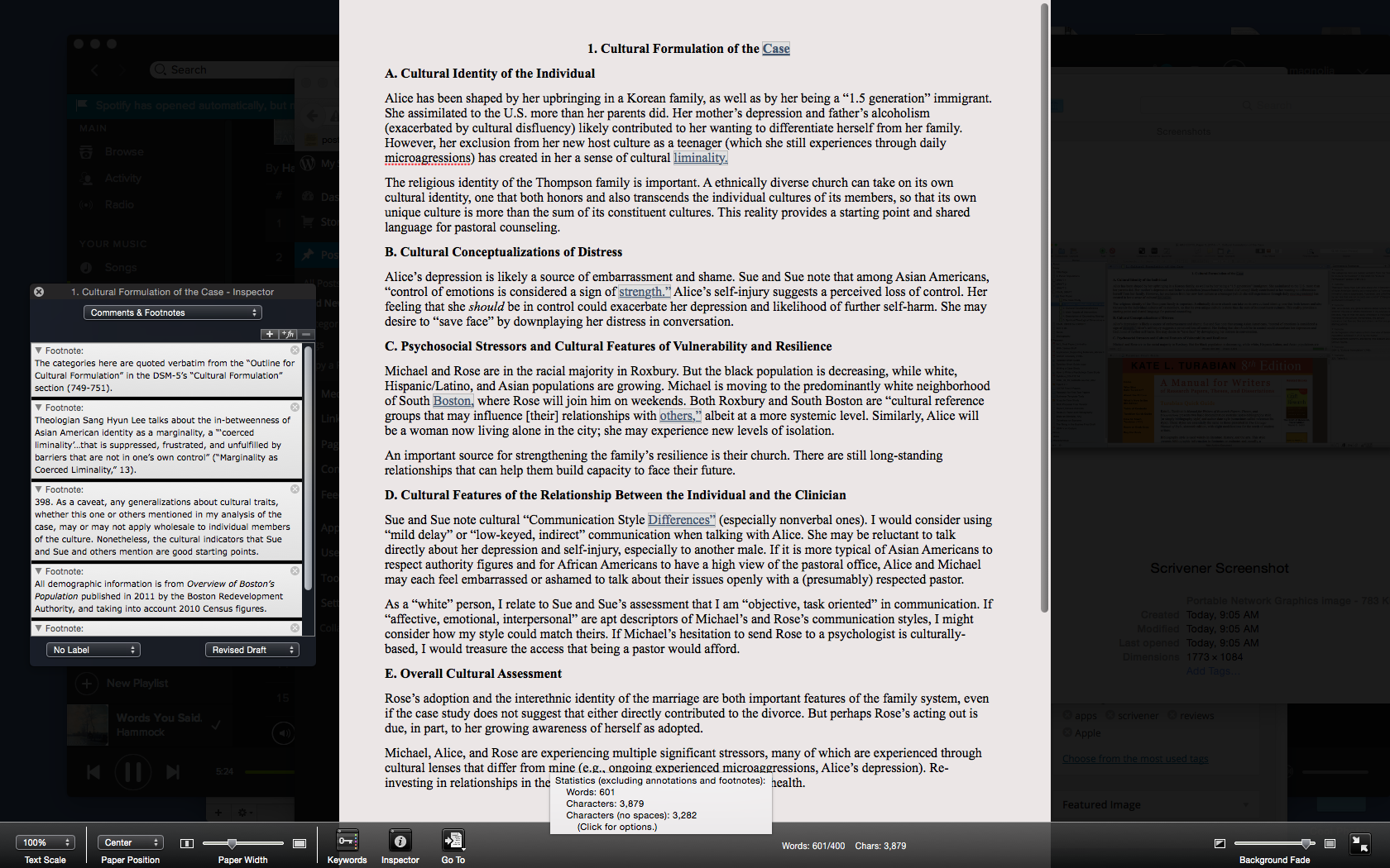Yes, Scrivener can go into full screen, but this is something a little different–a composition mode where you can just write. You’ll see at the bottom (a toolbar which goes away if you want it to) that I can still pull up essentials like the footnote window on the left. Or I can move all that out and just focus on writing.